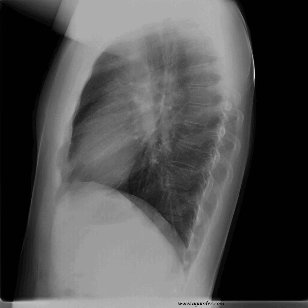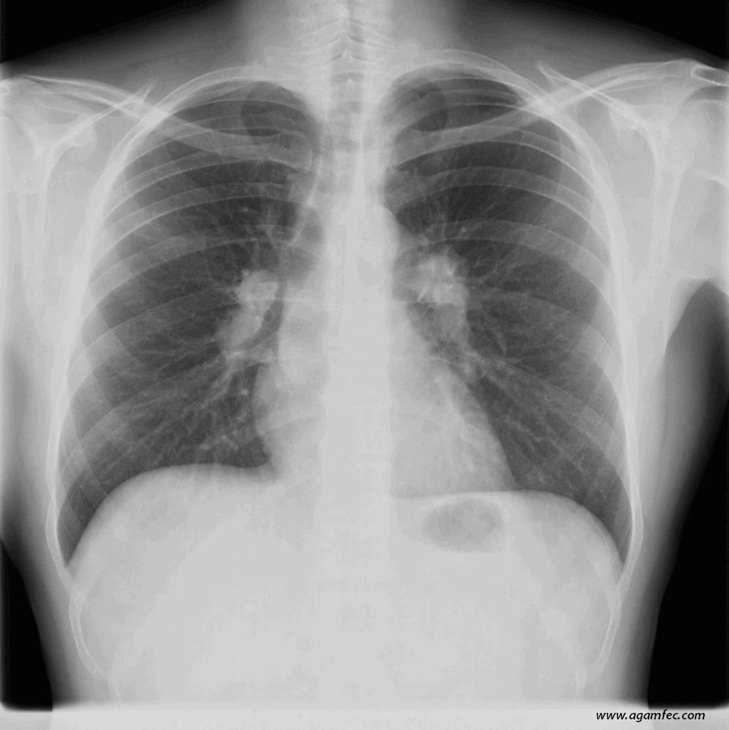 Figura 1. Radiografía de tórax PA y lateral de paciente con Eritema Nodoso, en la que se observan adenopatías hiliares bilaterales, sugestivas de Sarcoidosis